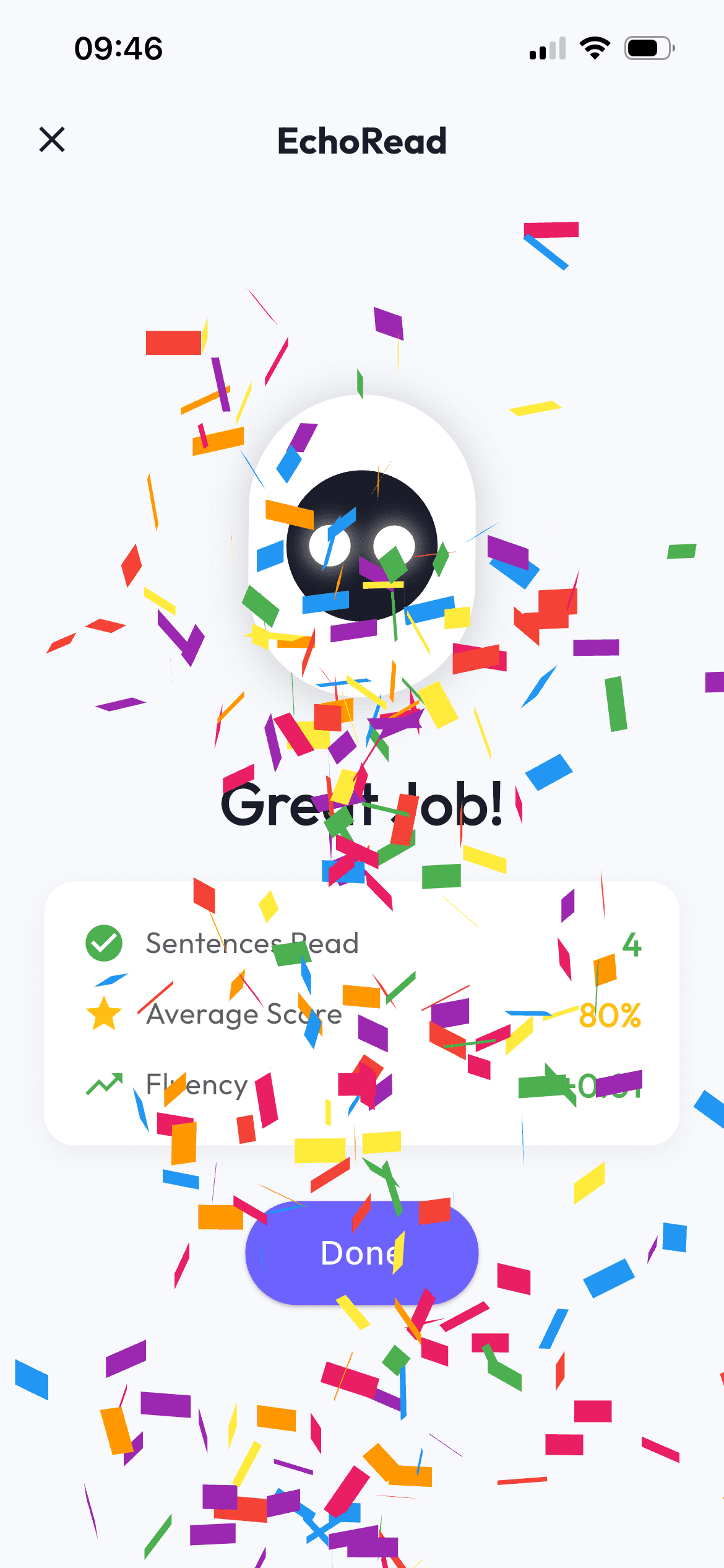 At the end of a session, Wundr offers simple, positive encouragement to help children feel confident and motivated to keep practicing.Feature description.